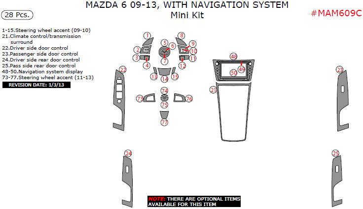 We offer a wide variety of colors and materials of Mazda 6 2009, 2010, 2011, 2012, 2013, With Navigation System, Mini Interior Kit, 28 Pcs. Choose your favourite option and place an order.