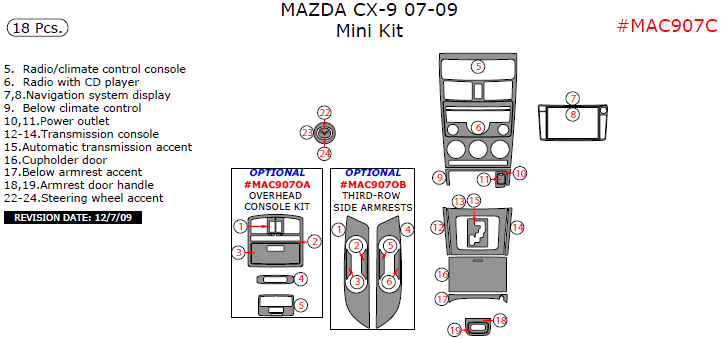 We offer a wide variety of colors and materials of Mazda CX-9 2007, 2008, 2009, Mini Interior Kit, 18 Pcs. Choose your favourite option and place an order.