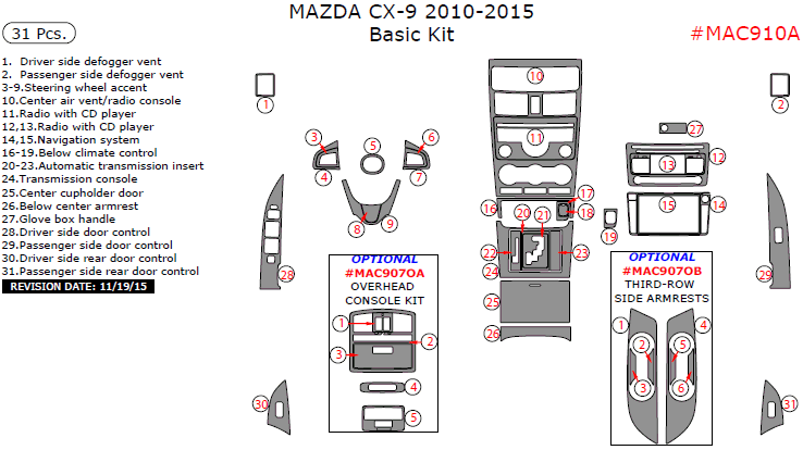 Mazda CX-9 2010, 2011, 2012, 2013, 2014, 2015, Basic Interior Kit, 31 Pcs.
