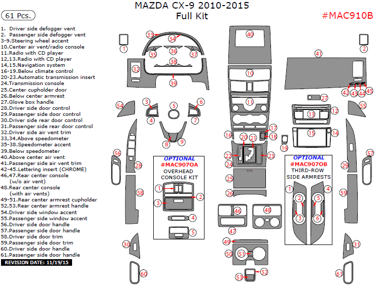 Mazda CX-9 2010, 2011, 2012, 2013, 2014, 2015, Full Interior Kit, 61 Pcs.