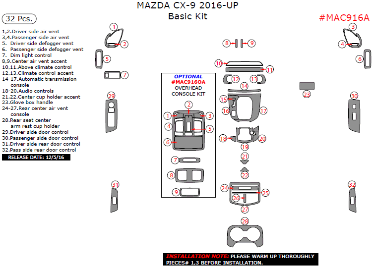 Mazda CX-9 2016, 2017, Basic Interior Kit, 32 Pcs.