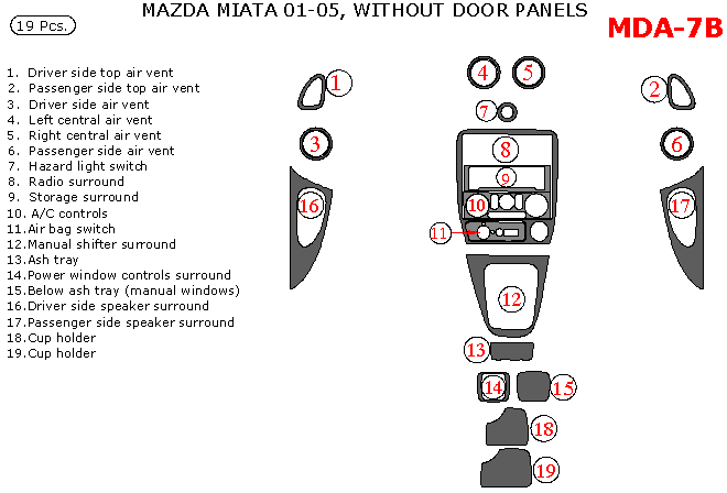 We offer a wide variety of colors and materials of Mazda Miata 2001, 2002, 2003, 2004, 2005, Interior Dash Kit, Without Door Panels, 19 Pcs. Choose your favourite option and place an order.