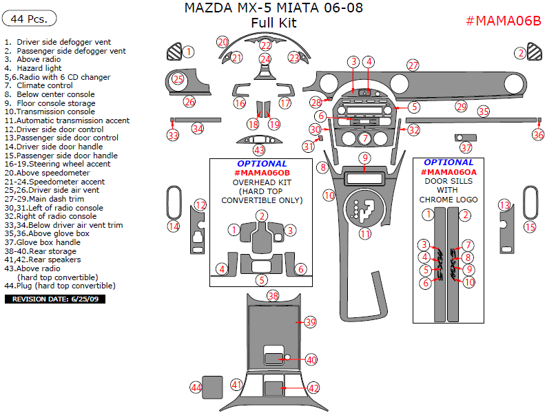 We offer a wide variety of colors and materials of Mazda Miata 2006, 2007, 2008, Full Interior Kit, 44 Pcs. Choose your favourite option and place an order.