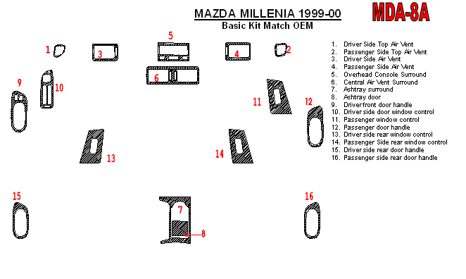 Mazda Millenia 1999-2000, Basic Interior Kit, Match OEM, 16 Pcs.