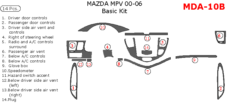 Mazda MPV 2000, 2001, 2002, 2003, 2004, 2005, 2006, Basic Interior Kit, 14 Pcs.