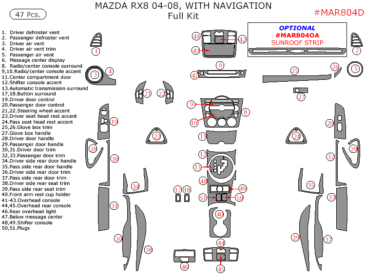 Mazda RX-8 2004, 2005, 2006, 2007, 2008, Full Interior Kit, With Navigation, 47 Pcs.