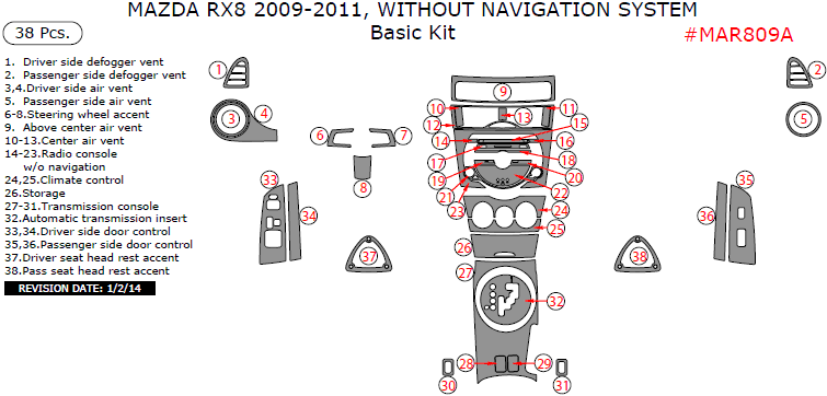 Mazda RX-8 2009, 2010, 2011, Without Navigation System, Basic Interior Kit, 38 Pcs.
