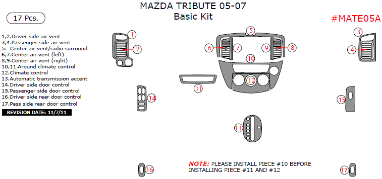 We offer a wide variety of colors and materials of Mazda Tribute 2005, 2006, 2007, Basic Interior Kit, 17 Pcs. Choose your favourite option and place an order.