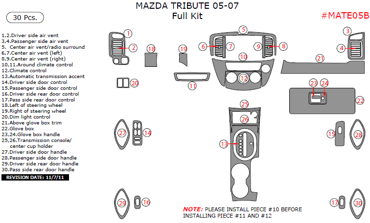 We offer a wide variety of colors and materials of Mazda Tribute 2005, 2006, 2007, Full Interior Kit, 30 Pcs. Choose your favourite option and place an order.