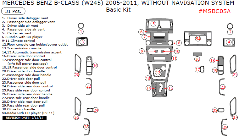 Mercedes Benz B-Class 2005, 2006, 2007, 2008, 2009, 2010, 2011, Without Navigation System, Basic Interior Kit, 31 Pcs.
