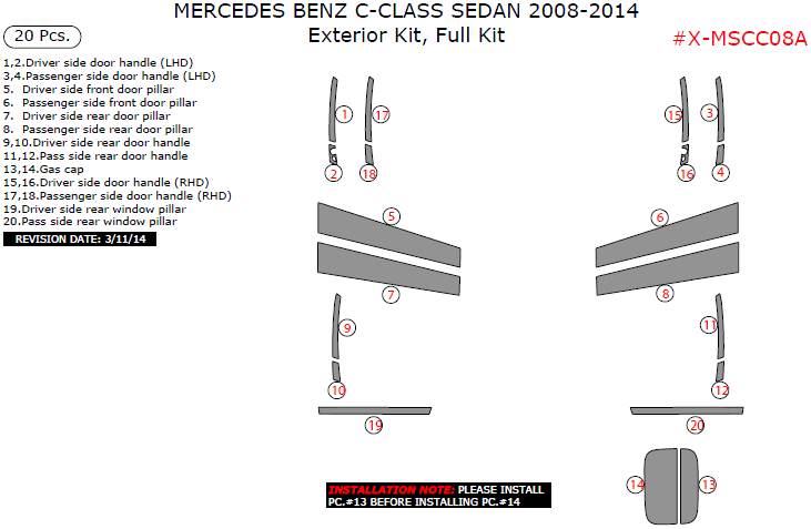 Mercedes C-Class 2008, 2009, 2010, 2011, 2012, 2013, 2014, Exterior Kit, Full Kit (Sedan Only), 20 Pcs.