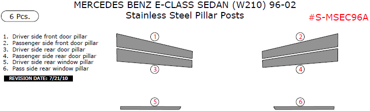 Mercedes E-Class Sedan (W210) 1996, 1997, 1998, 1999, 2000, 2001, 2002, Stainless Steel Pillar Posts, 6 Pcs.
