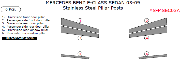 Mercedes Benz E-Class Sedan 2003, 2004, 2005, 2006, 2007, 2008, 2009, Stainless Steel Pillar Posts, 6 Pcs.