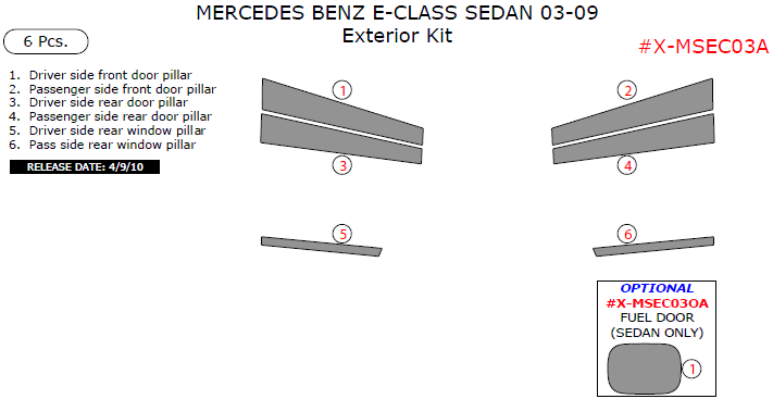 Mercedes E-Class 2003, 2004, 2005, 2006, 2007, 2008, 2009, Exterior Kit (Sedan Only), 6 Pcs.