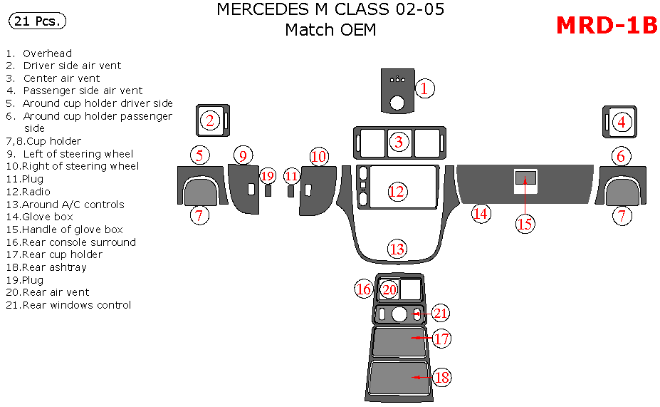 We offer a wide variety of colors and materials of Mercedes M-Class 2002, 2003, 2004, 2005, Interior Dash Kit, 21 Pcs., Match OEM. Choose your favourite option and place an order.