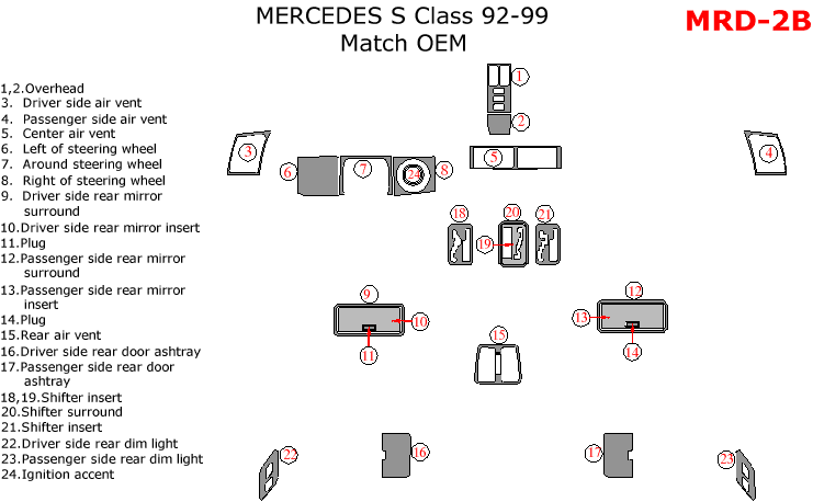 Mercedes S-Class 1992, 1993, 1994, 1995, 1996, 1997, 1998, 1999, Interior Dash Kit, Match OEM, 24 Pcs.