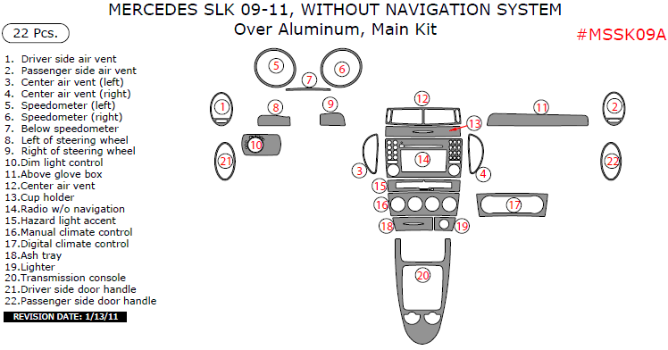 Mercedes SLK 2009, 2010, 2011, Without Navigation System, Over Aluminum, Main Interior Kit, 22 Pcs.