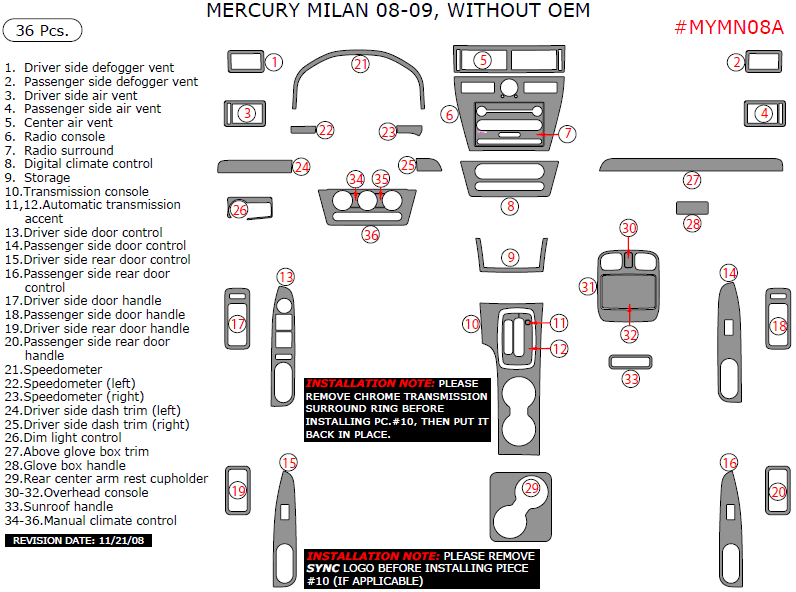 Mercury Milan 2008-2009, Interior Dash Kit, Without OEM, 36 Pcs.