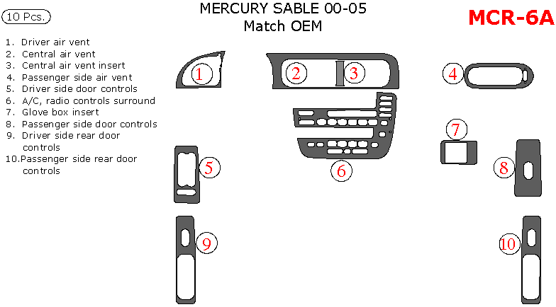 We offer a wide variety of colors and materials of Mercury Sable 2000, 2001, 2002, 2003, 2004, 2005, Interior Dash Kit, Match OEM, 10 Pcs. Choose your favourite option and place an order.