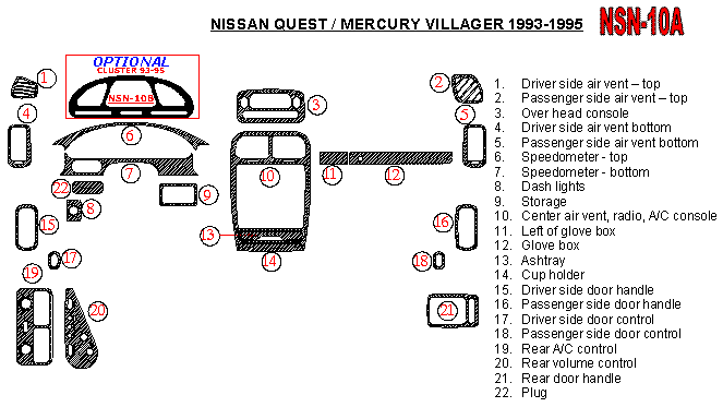 We offer a wide variety of colors and materials of Mercury Villager 1993, 1994, 1995, Nissan Quest 1993-1995, Full Interior Kit, 22 Pcs. Choose your favourite option and place an order.