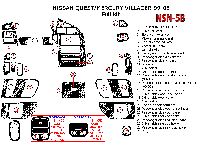 We offer a wide variety of colors and materials of Mercury Villager/Nissan Quest 1999, 2000, 2001, 2002, 2003, Full Interior Kit, 27 Pcs. Choose your favourite option and place an order.