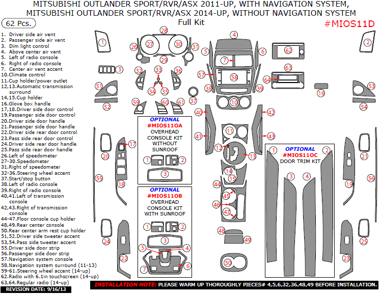 Mitsubishi ASX/Outlander Sport/RVR 2011, 2012, 2013, 2014, 2015, With Navigation System Or Without Navigation System (2014, 2015, 2016), Full Interior Kit, 62 Pcs.