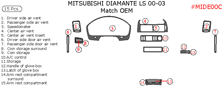 Mitsubishi Diamante 2000, 2001, 2002, 2003, Interior Dash Kit, LS, Match OEM, 15 Pcs.