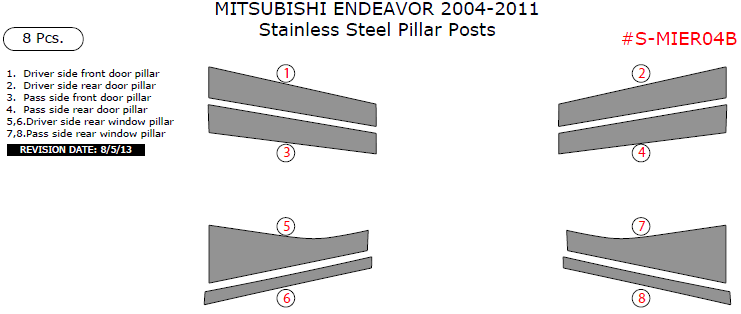 We offer a wide variety of colors and materials of Mitsubishi Endeavor 2004, 2005, 2006, 2007, 2008, 2009, 2010, 2011, Stainless Steel Pillar Posts, 8 Pcs. Choose your favourite option and place an order.