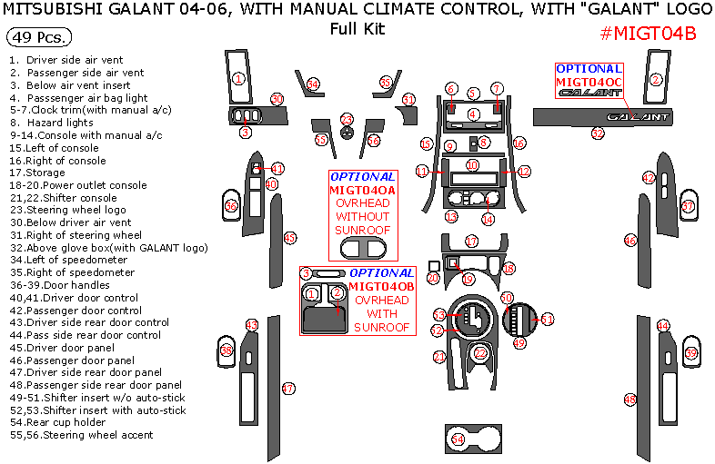 Mitsubishi Galant 2004, 2005, 2006, With Manual Climate Control, Full Interior Kit, With "Galant" Logo, 49 Pcs.