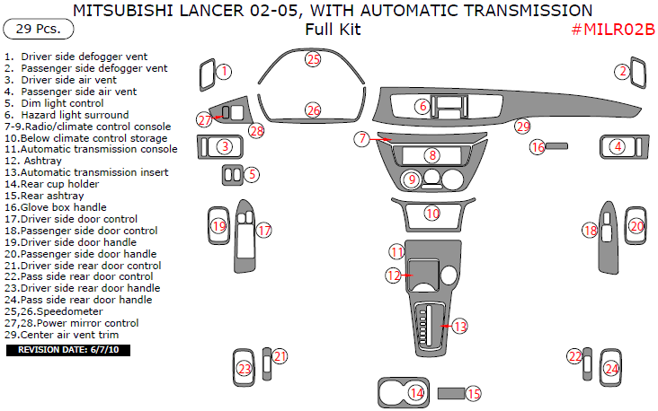Mitsubishi Lancer 2002, 2003, 2004, 2005, With Automatic Transmission, Full Interior Kit, 29 Pcs.
