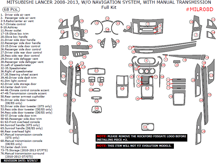 Mitsubishi Lancer 2008, 2009, 2010, 2011, 2012, 2013, Without Navigation System, With Manual Transmission, Full Interior Kit, 68 Pcs.