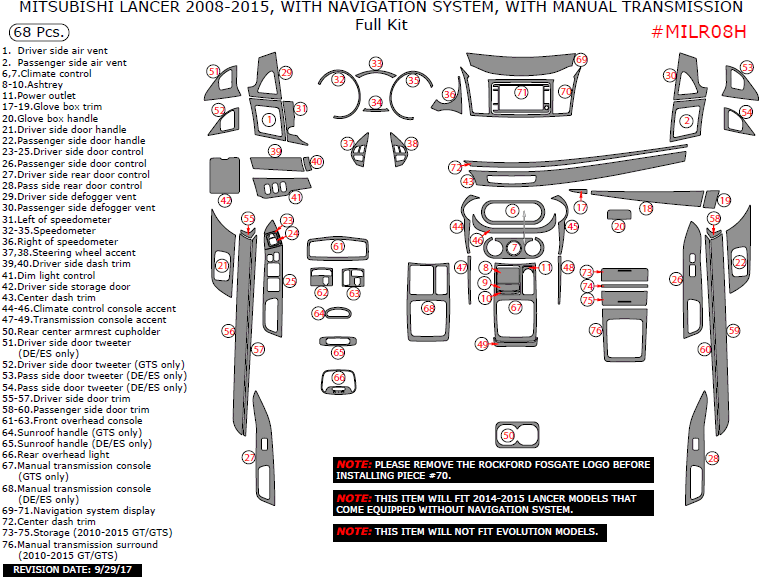 Mitsubishi Lancer 2008, 2009, 2010, 2011, 2012, 2013, 2014, 2015, With Navigation System, With Manual Transmission, Full Interior Kit, 68 Pcs.