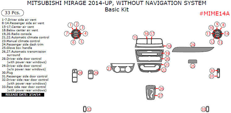Mitsubishi Mirage 2014, 2015, 2016, 2017, Without Navigation System, Basic Interior Kit, 33 Pcs.