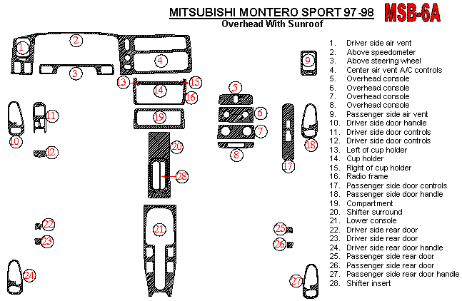 Mitsubishi Montero Sport 1997-1998, Interior Dash Kit, With Overhead, With Sunroof, 28 Pcs.