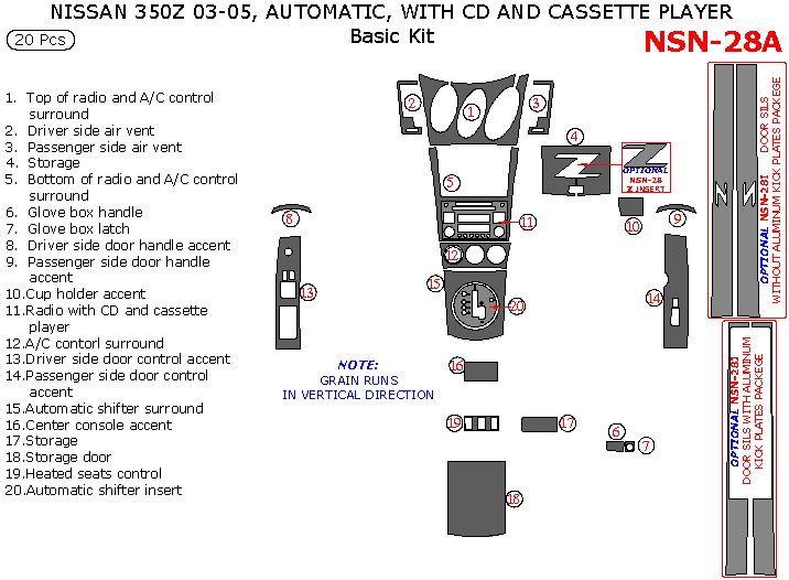Nissan 350Z 2003, 2004, 2005, Basic Interior Kit, Automatic, With CD and Cassette Player, 20 Pcs.