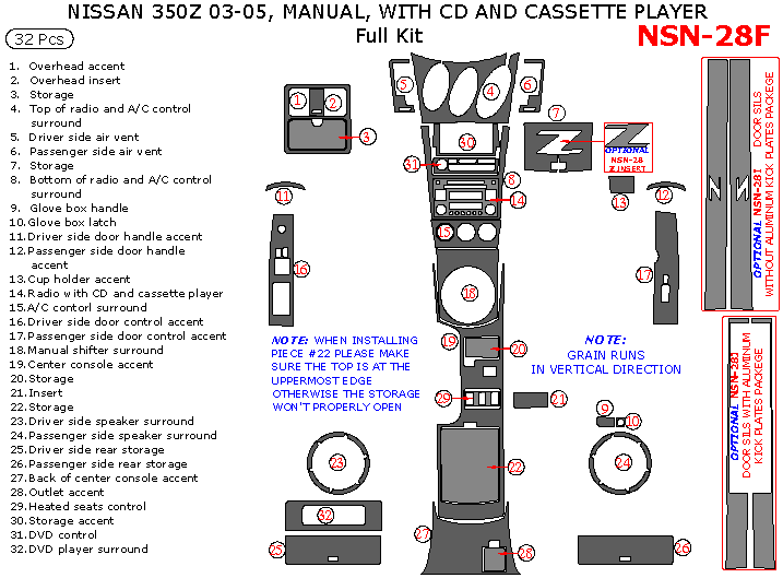 Nissan 350Z 2003, 2004, 2005, Full Interior Kit, Manual, With CD and Cassette Player, 32 Pcs.