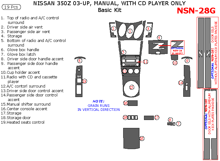We offer a wide variety of colors and materials of Nissan 350Z 2003, 2004, 2005, Basic Interior Kit, Manual, With CD Player Only, 19 Pcs. Choose your favourite option and place an order.