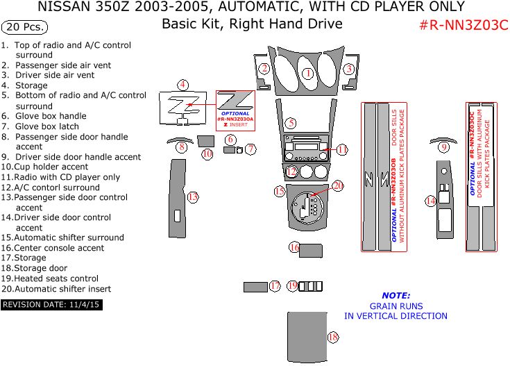 Nissan 350Z 2003, 2004, 2005 (Right Hand Drive), Basic Interior Kit, Automatic, With CD Player Only, 20 Pcs.