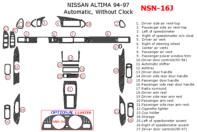 Nissan Altima 1994, 1995, 1996, 1997, Full Interior Kit, Automatic, Without Clock, 27 Pcs.