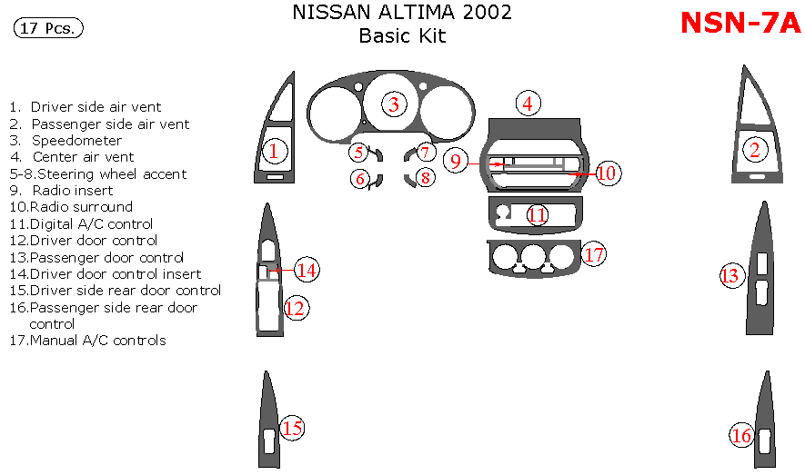 Nissan Altima 2002, Basic Interior Kit, 17 Pcs.