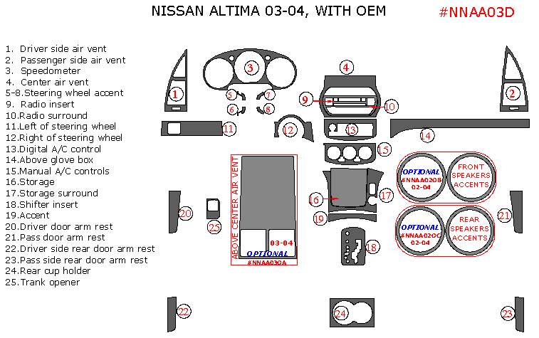 We offer a wide variety of colors and materials of Nissan Altima 2003-2004, Sedan, Full Interior Kit, 25 Pcs., OEM Match. Choose your favourite option and place an order.