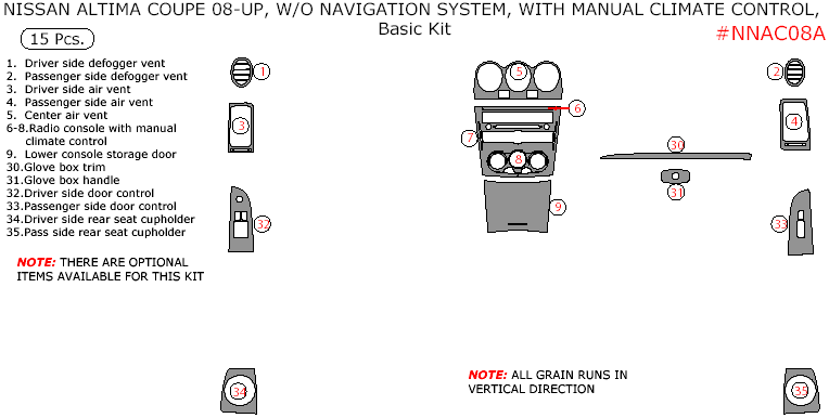 Nissan Altima 2008, 2009, 2010, 2011, 2012, 2013, Coupe, W/o Navigation System, With Manual Climate Control, Basic Interior Kit, 15 Pcs.