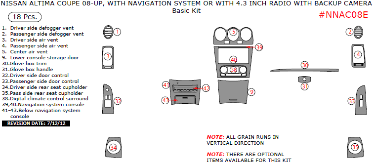 We offer a wide variety of colors and materials of Nissan Altima 2008, 2009, 2010, 2011, 2012, 2013, Coupe, With Navigation System Or With 4.3 Inch Radio With Backup Camera, Basic Interior Kit, 18 Pcs. Choose your favourite option and place an order.