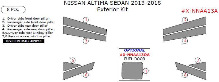 Nissan Altima Sedan 2013, 2014, 2015, 2016, 2017, 2018, Exterior Kit, 8 Pcs.