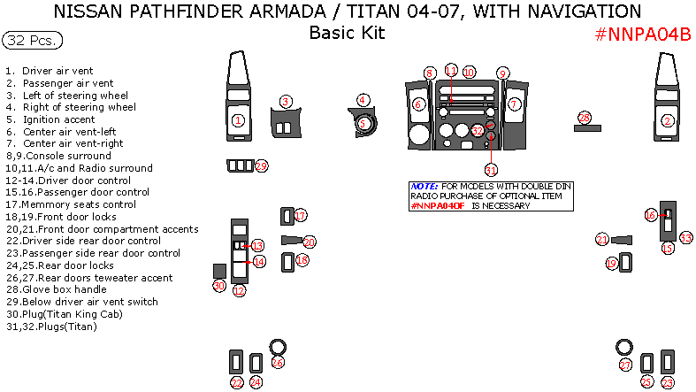 Nissan Armada/Titan 2004, 2005, 2006, 2007, With Navigation, Basic Interior Kit, 32 Pcs.