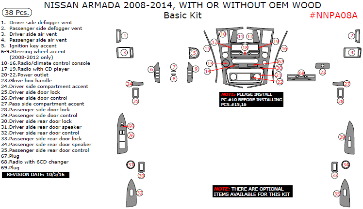 Nissan Armada 2008, 2009, 2010, 2011, 2012, 2013, 2014, Interior Dash Kit, Optional Front Overhead With Sunroof, 10 Pcs.