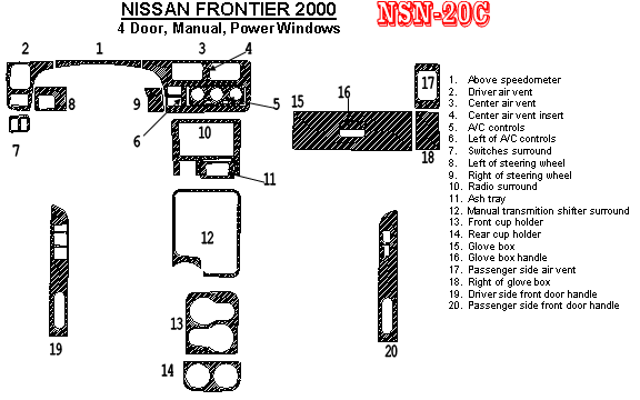 We offer a wide variety of colors and materials of Nissan Frontier 1998, 1999, 2000, Interior Dash Kit, Manual, 4 Door With Power Windows, 20 Pcs. Choose your favourite option and place an order.