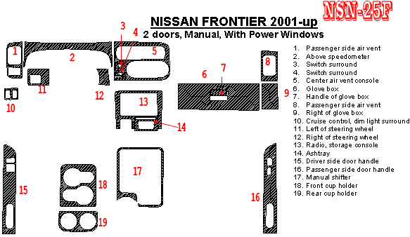 Nissan Frontier 2001, Interior Dash Kit, Manual, 2 Door, With Power Windows, 19 Pcs.