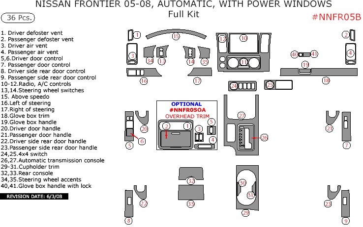 Nissan Frontier 2005, 2006, 2007, 2008, Automatic, With Power Windows, Full Interior Kit, 36 Pcs.