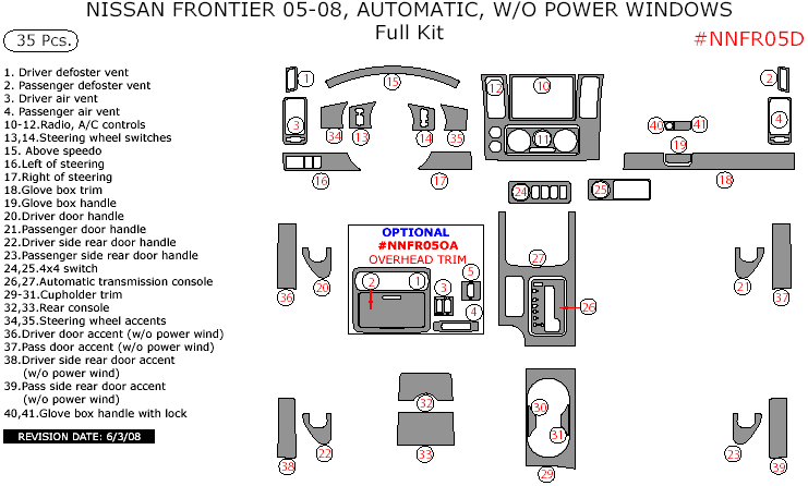 We offer full interior dash kit of 35 pieces in a wide variety of colors (black, red, etc.) and materials (wood, chrome, carbon fiber, etc.) for Nissan Frontier 2005, 2006, 2007, 2008, automatic, without power windows. Select your favourite option of 2005-2008 Nissan Frontier interior accessory and place an order to buy the high-quality dash trim kit.
